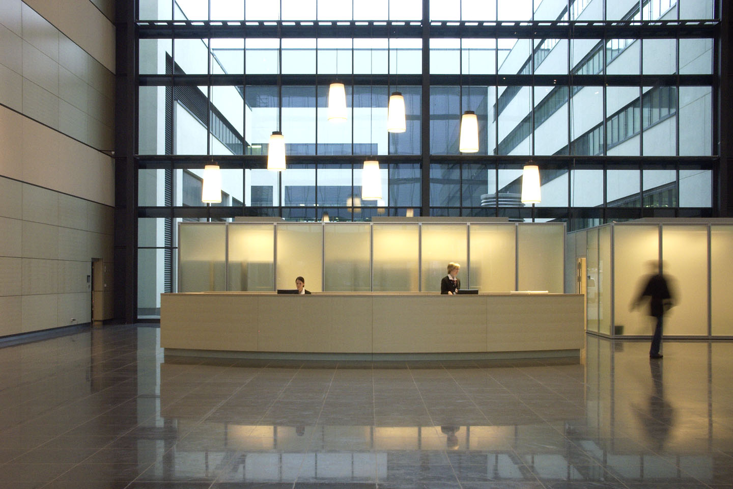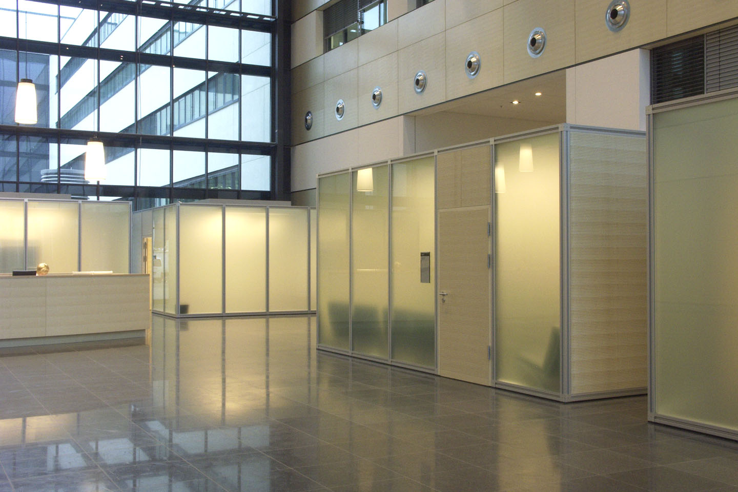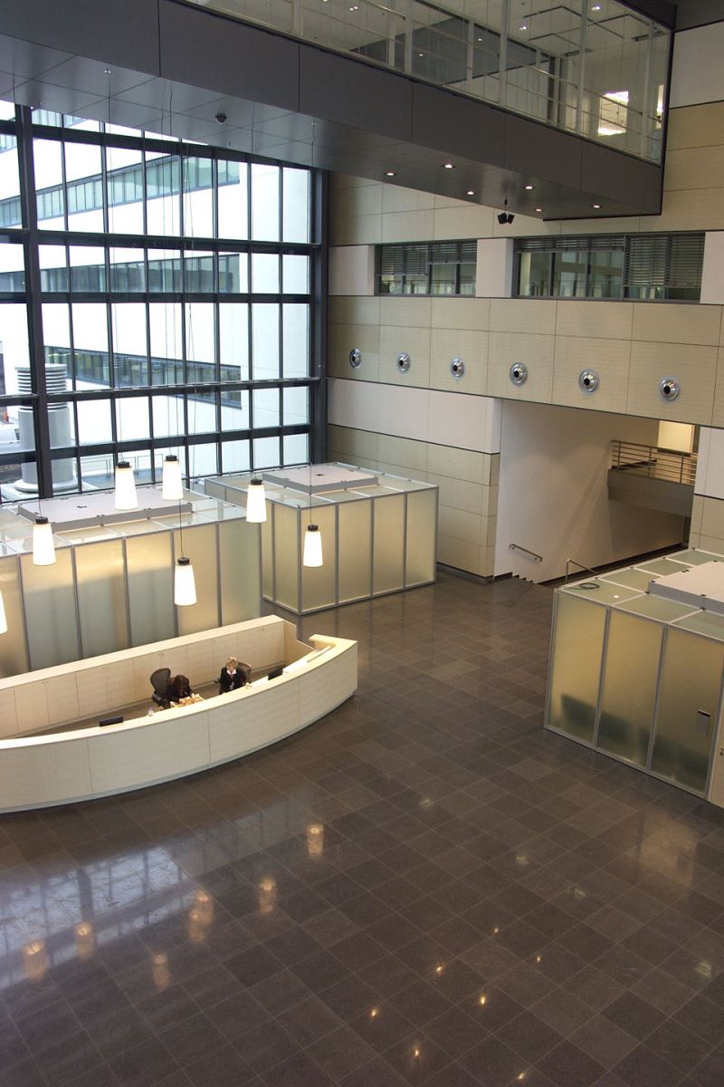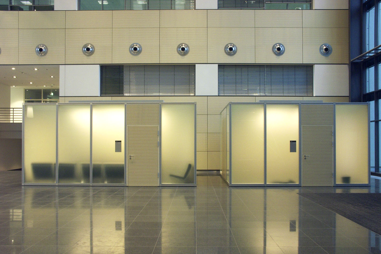 AMD, einer der weltgrößten Chiphersteller, suchte für seinen Standort Dresden Lösungen für Besprechungsräume mit unterschiedlichen Anforderungen. Gemeinsam mit der HWP Planungsgesellschaft, Stuttgart und dem Reinraumhersteller M+W Zander entwickelten wir im Atrium des Gebäudes vier Einzelkuben aus dem Architektursystem pila office mit einer Gesamtfläche von 150 m².Um den Vorgaben des Schallschutzes (37 dB), der Sprachverständlichkeit (0,8 sec) und der optischen Separierung bei maximalem Tageslichtanteil gerecht zu werden, arbeiteten wir mit satiniertem Sicherheitsglas in Wänden und Decken – in Kombination mit Füllungen in Sandwichbauweise. Die Be- und Entlüftung wird durch die Klimaanlage in Verbindung mit zusätzlichen Systemventilatoren geregelt. Integriert wurden Sprinkleranlage, Kameras, Rauchmelder und Lautsprecher, dimmbare Lichtdecken aus Systemlichtfeldern, Beamerhalterungen und Projektionsflächen.
