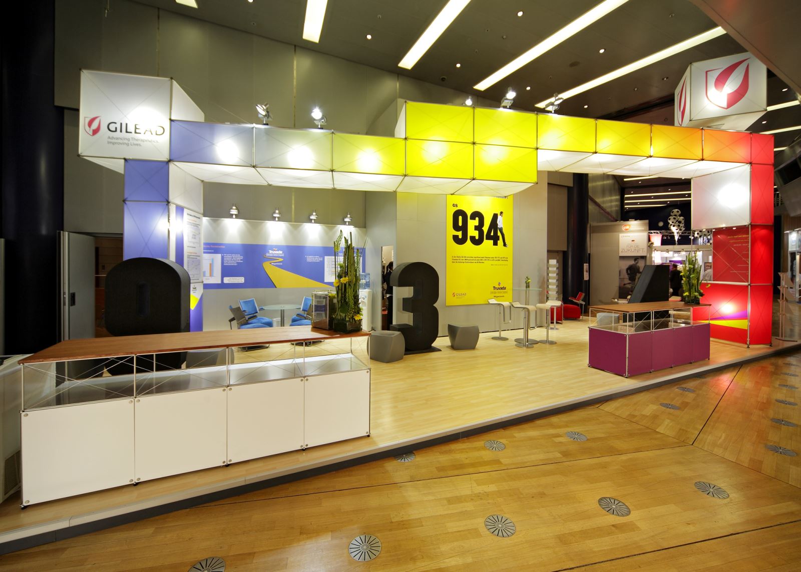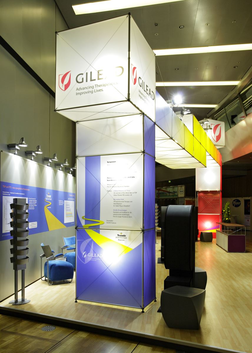 ...Präsentierte sich die deutsche Vertretung von Gilead Sciences mit einem Messestand realisiert mit dem Architektursystem pon – Highlights waren die farbigen Akzente durch integrierte Leuchtkörper.