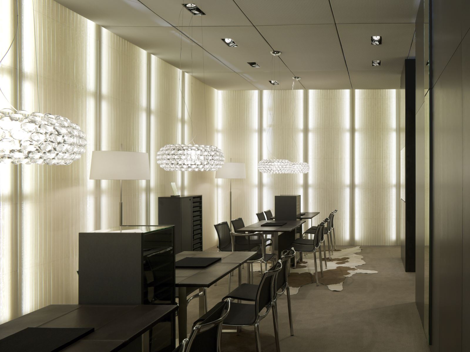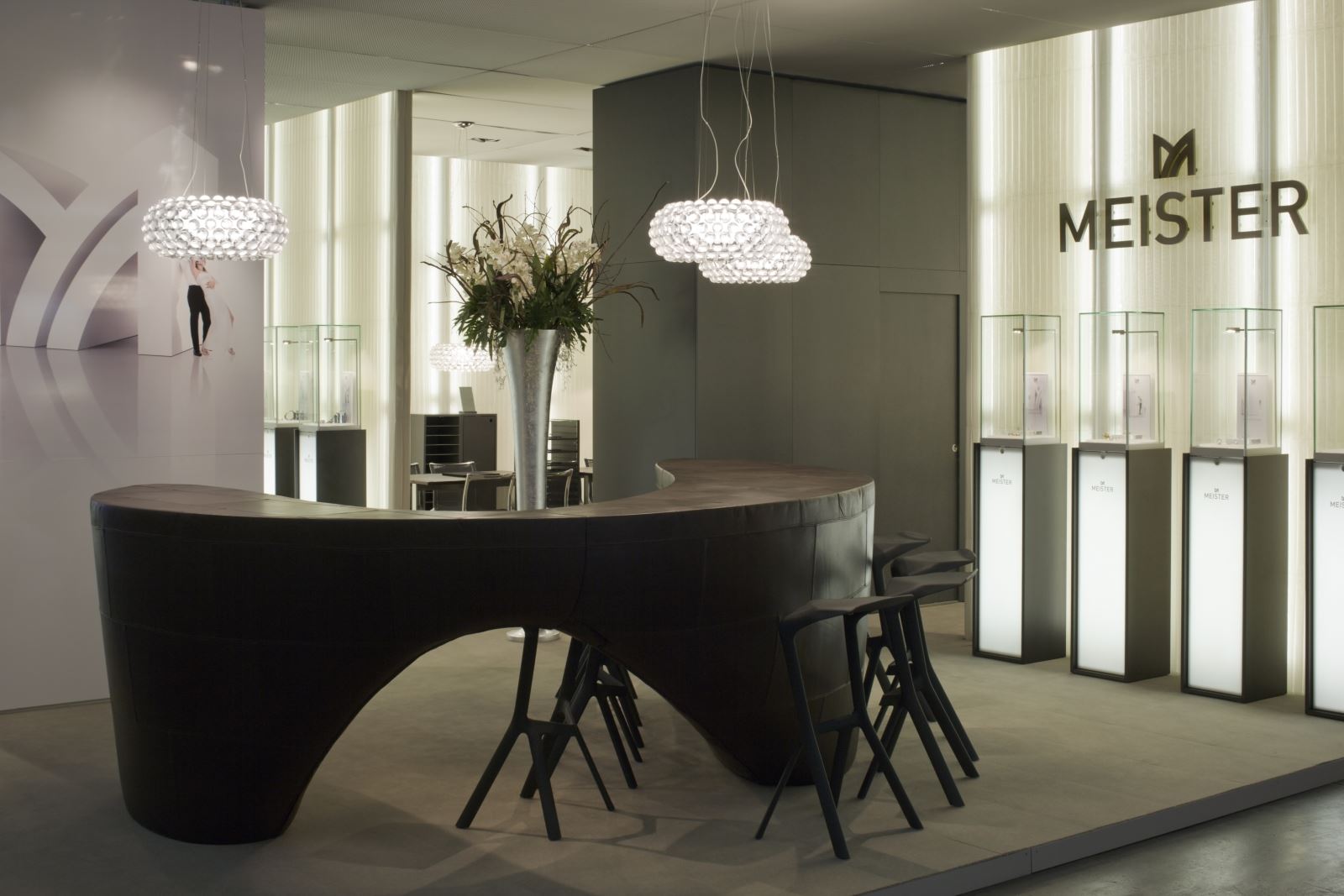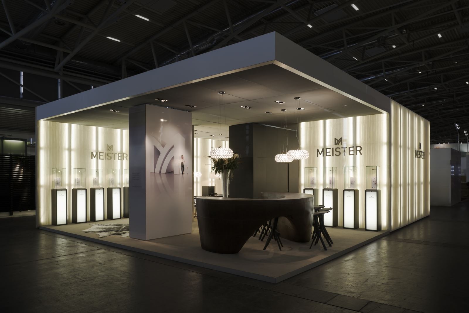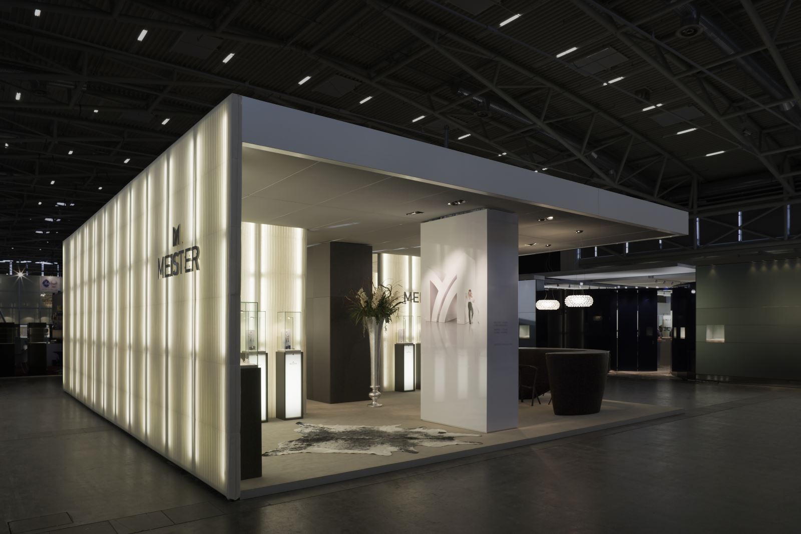 Unter Wiederverwendung des bei vorherigen Auftritten eingesetzten Basissystemmaterials ergab sich, mit einer innovativen textilen Hülle versehen, ein völlig neuer Auftritt. Die fugenlos vertikal verspannten Stoffe lassen das System in den Hintergrund treten. Die Hinterleuchtung taucht den Stand nach außen und nach innen in ein warmes Licht. Besonders fasziniert der Kontrast der technisch anmutenden Streckmetalldecke zur lichten, atmosphärischen Wirkung der Wände.