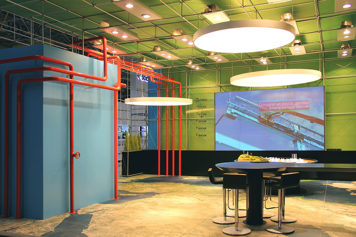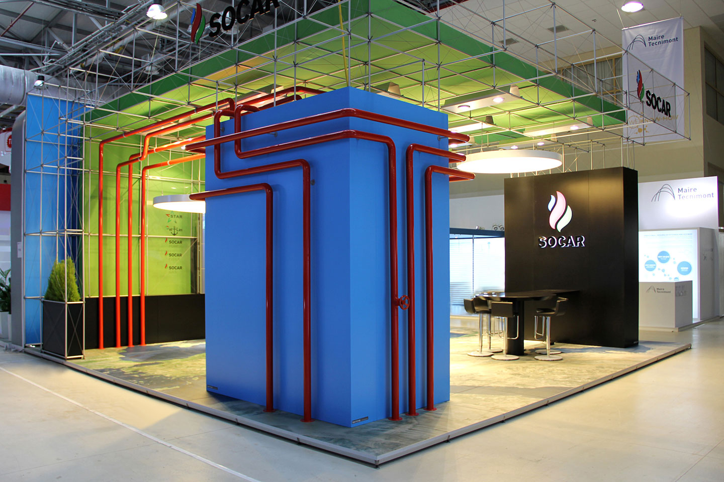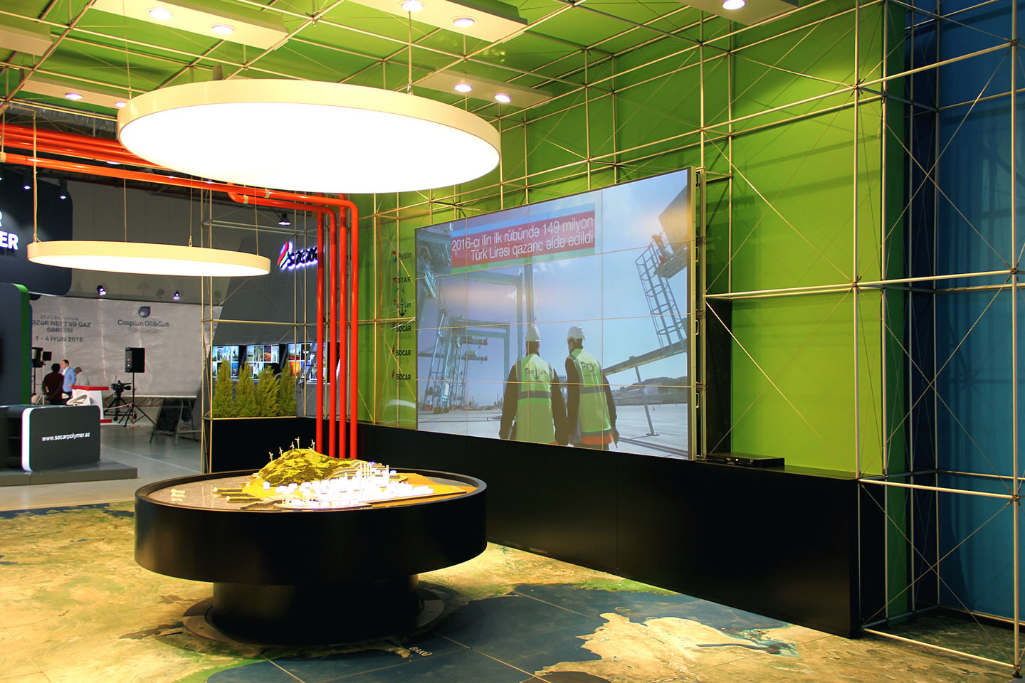 Mit der Stilisierung der Corporate Farben von Socar wurde die allgemeine Kabinenarchitektur die Spuren des architektonischen Charakters einer petrochemischen Anlage vermittelt. Auf einer konstruktiven Struktur, ein riesiger Bildschirm im Hintergrund. Das SOCAR-Handelsvolumen sowie die numerischen Prognosen der Zukunfts- und Investitionsfunktionen wurden in einem speziellen Film präsentiert.