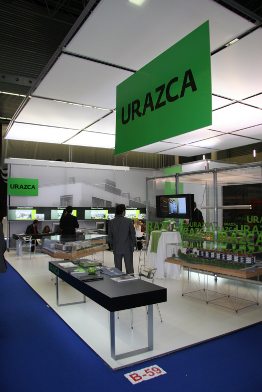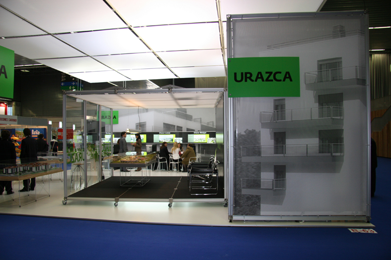 Für den Messeauftritt der Firma Urazca bei der Eröffnung der neuen Immobilienhalle im Bilbao Exhibition Centre in Bilbao verwendete unser Partner Arista diseño, s. l. die Architektursysteme pila petite und clic.
